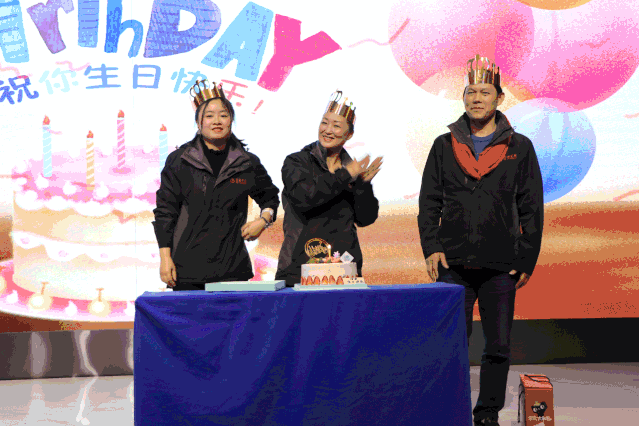 年會上,公司還為本月過生日的員工舉行了生日會。眾人齊唱著生日祝福歌,壽星們頭戴著皇冠,許下自己新一年的愿望。