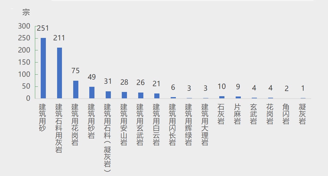 全國新設砂石礦權中,有建筑用砂、建筑石料用灰巖、建筑用花崗巖、建筑用砂巖、建筑用石料(凝灰巖)、建筑用安山巖、建筑用玄武巖、建筑用白云巖、石灰巖、片麻巖、建筑用閃長巖、玄武巖、花崗巖、建筑用輝綠巖、建筑用大理巖、角閃巖、凝灰巖17種礦種。其中建筑用砂、建筑石料用灰巖兩類礦種新設數量最多,分別為251宗、211宗;建筑用花崗巖礦75宗;建筑用砂巖、建筑用石料(凝灰巖)、建筑用安山巖、建筑用玄武巖、建筑用白云巖五類礦種新設數量在20~50宗;建筑用閃長巖、建筑用輝綠巖、建筑用大理巖三類礦種新設數量在10宗以內;另外,新設10宗石灰巖礦、9宗片麻巖礦、4宗玄武巖礦、4宗花崗巖礦、2宗角閃巖礦、1宗凝灰巖礦。