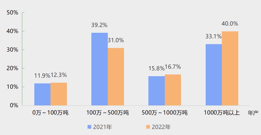 新設砂石礦權中,資源儲量大于1000萬噸的超大型砂石礦權、資源儲量在500萬~1000萬噸之間的大型砂石礦權,占比分別提升至40.0%、16.7%,占比均較2021年有所提升。另外,資源儲量在100萬~500萬噸之間的中型砂石礦權占比為31.0%;資源儲量在100萬噸以下的小型砂石礦權占比為12.3%,中型、小型砂石礦權占比均較2021年有所下降。